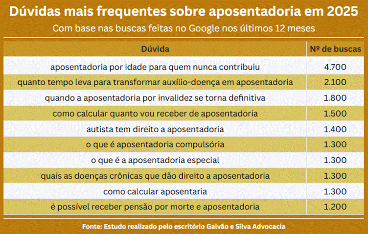 Segundo o estudo, as buscas pelo termo “aposentadoria” cresceram 84,91% em 2025, em comparação com 2024, ultrapassando 3 milhões de pesquisas anuais.