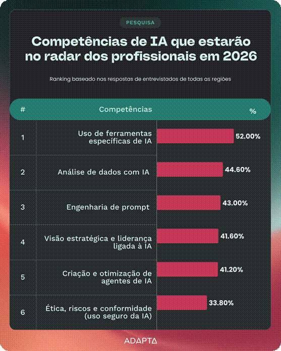Com a IA já incorporada ao cotidiano das empresas, muitos profissionais começam a direcionar seus esforços para competências cada vez mais estratégicas. A constatação é de um estudo da Adapta, maior ecossistema de IA generativa do país: entre as habilidades que estarão no radar dos brasileiros em 2026, destacam-se a análise de dados com IA (44,6%), a engenharia de prompt (43%) e a visão estratégica para orientar equipes no uso de IA (41,6%), além do domínio de ferramentas que complementem esse repertório técnico (52%).